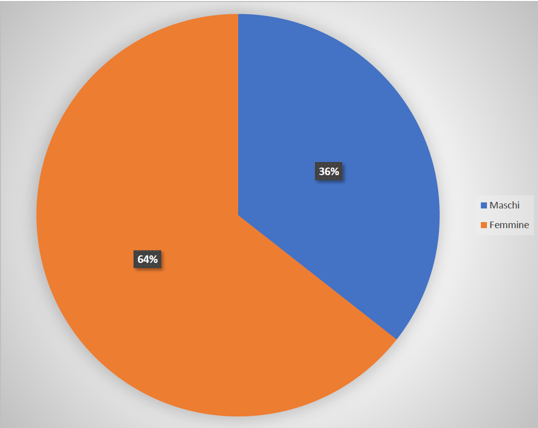 La maggior parte dei soggetti che ha avuto accesso al Pronto Soccorso Psicologico è di sesso femminile, nello specifico il 64%, mentre il 36% è di sesso maschile.