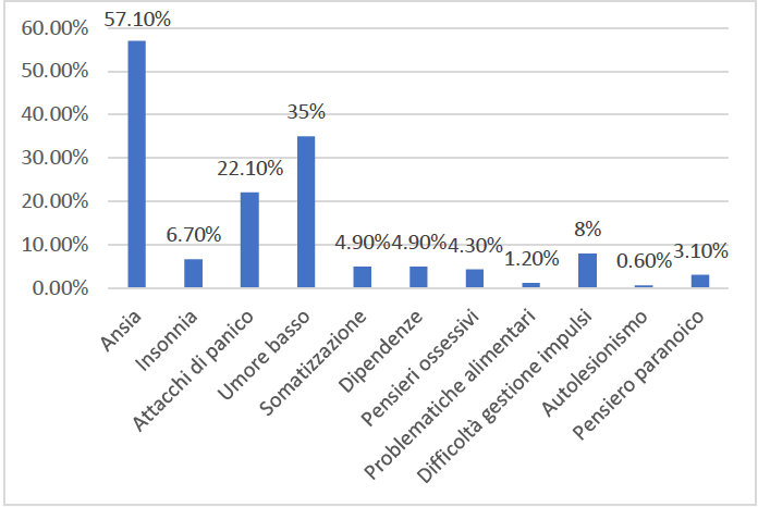 Poco più della metà dei soggetti si rivolge al Servizio per problemi di ansia e un terzo per problemi legati all’umore che potrebbero essere inquadrati con problemi depressivi, segue un 22% di soggetti che soffre di attacchi di panico e più di un terzo per altre problematiche.