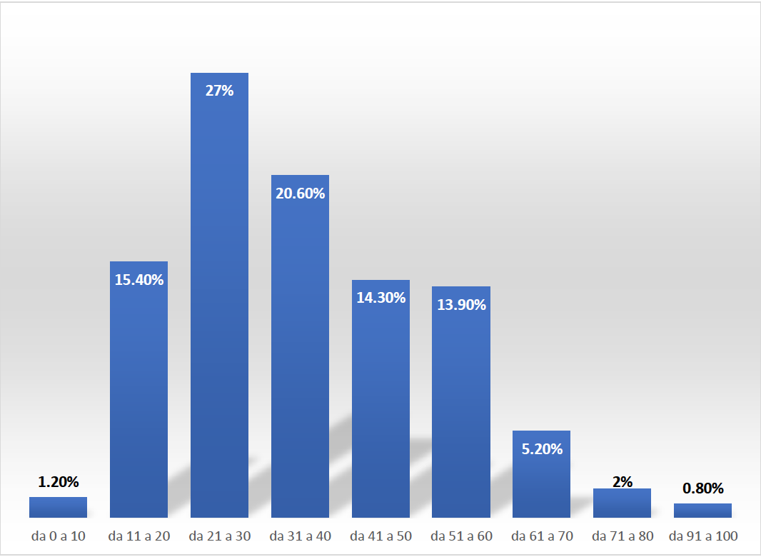Rispetto alle fasce di età i valori percentuali di ansia sono superiori tra i soggetti compresi tra i 21 e i 30 anni e tra i quaranta e i 50 (60% circa), l’ansia si riduce di qualche punto percentuale tra i soggetti che hanno un’età compresa tra i 31 e i 40 anni (54,6%);