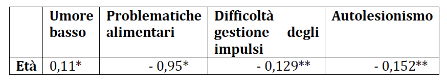 Per cui, al crescere dell’età aumentano significativamente i problemi di umore deflesso mentre diminuiscono quelli legati all’alimentazione, all’autolesionismo e alla gestione degli impulsi.